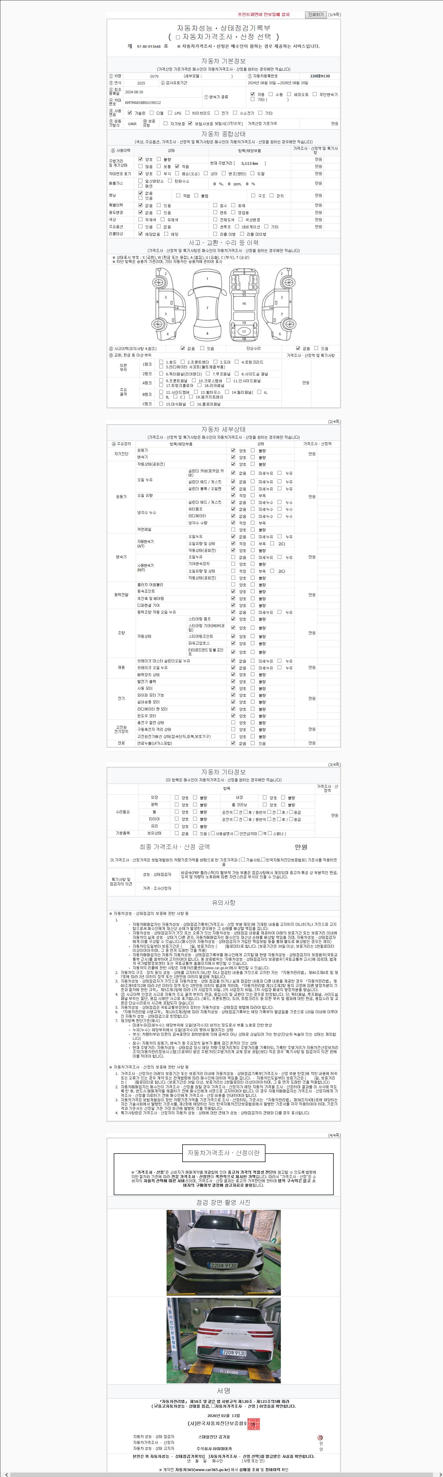| 주행거리 | 5,117 km | 차량번호 | 220마9130 | 사고유무 | 성능기록부 참조 | 제시번호 | 제 2026019840 호 |