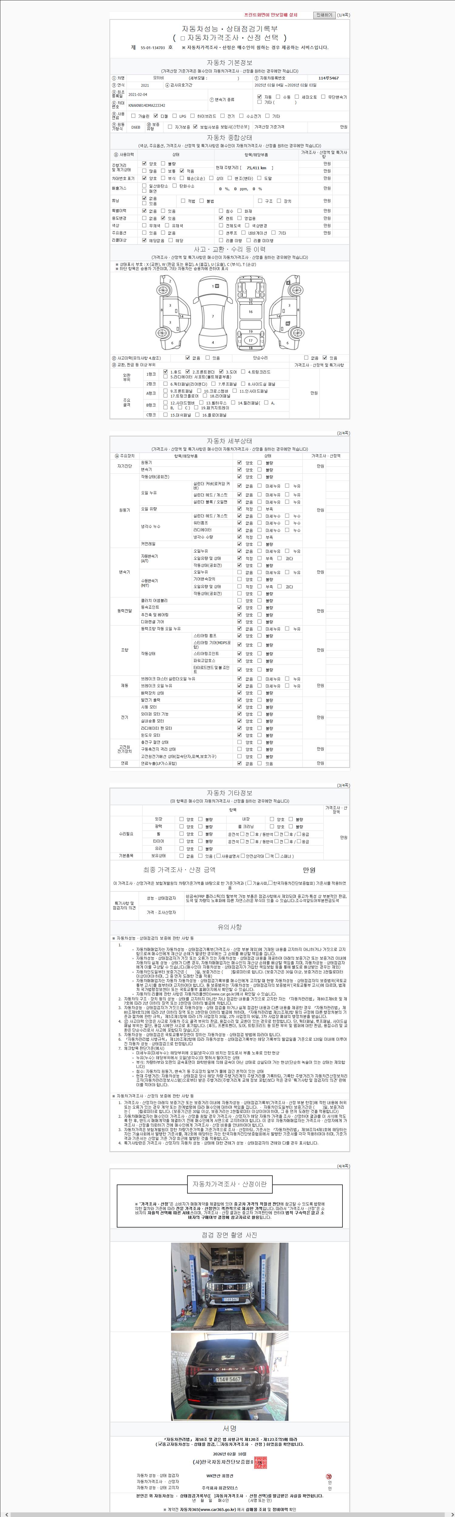 | 주행거리 | 75,411 km | 차량번호 | 114루5467 | 사고유무 | 성능기록부 참조 | 제시번호 | 제 2147483647 호 |
