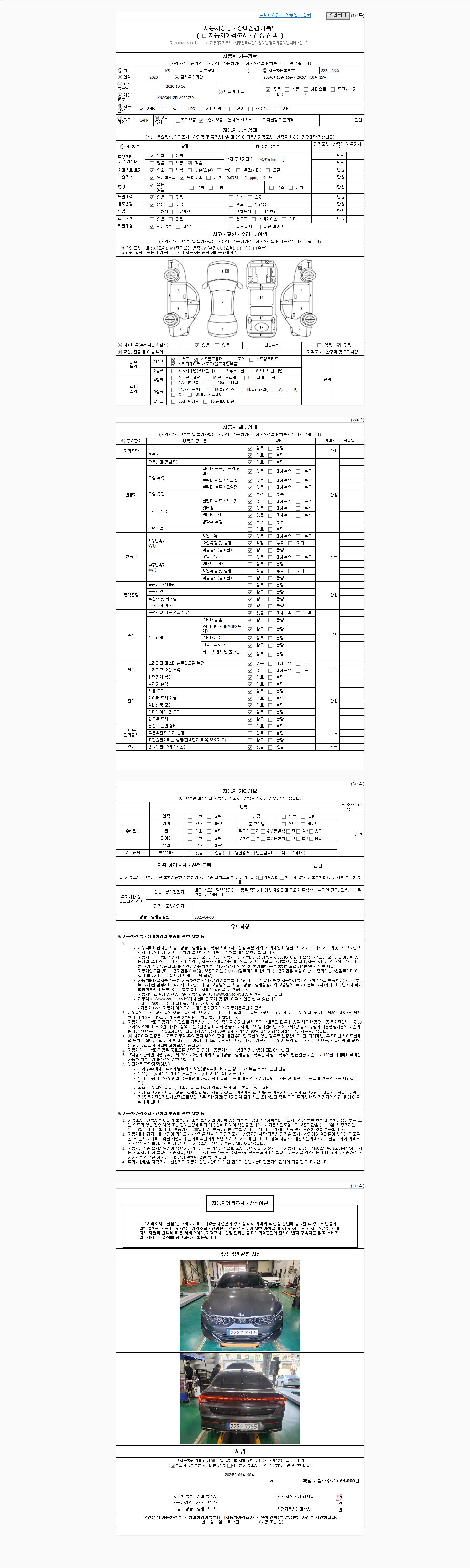 | 주행거리 | 93,916 km | 차량번호 | 222우7755 | 사고유무 | 성능기록부 참조 | 제시번호 | 제 2026018180 호 |