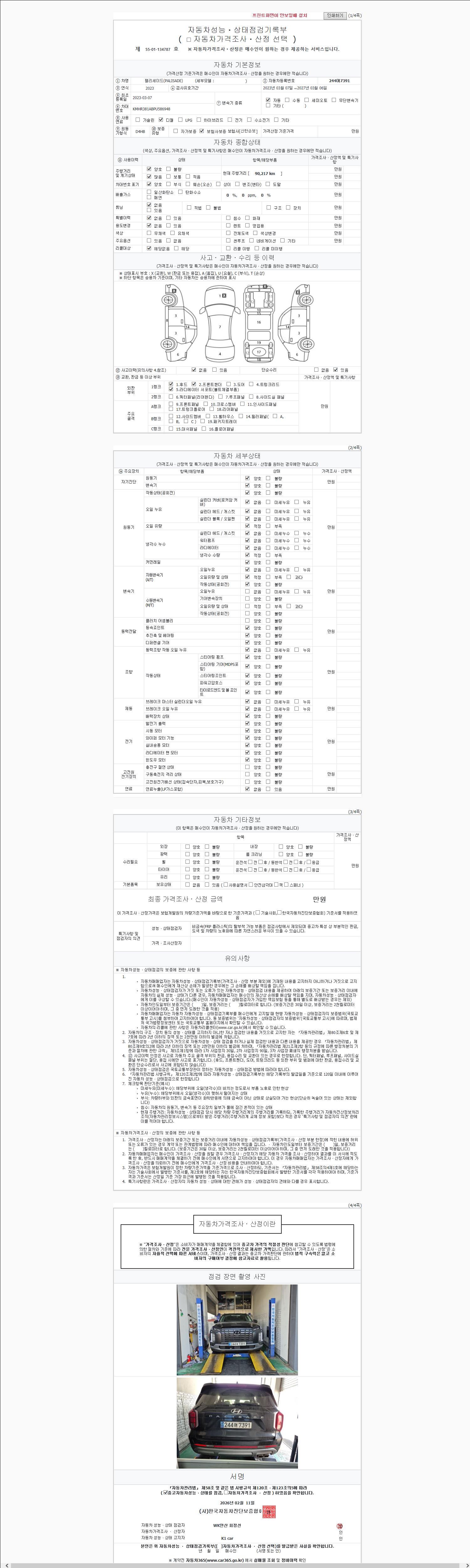 | 주행거리 | 90,206 km | 차량번호 | 244어7391 | 사고유무 | 성능기록부 참조 | 제시번호 | 제 2147483647 호 |