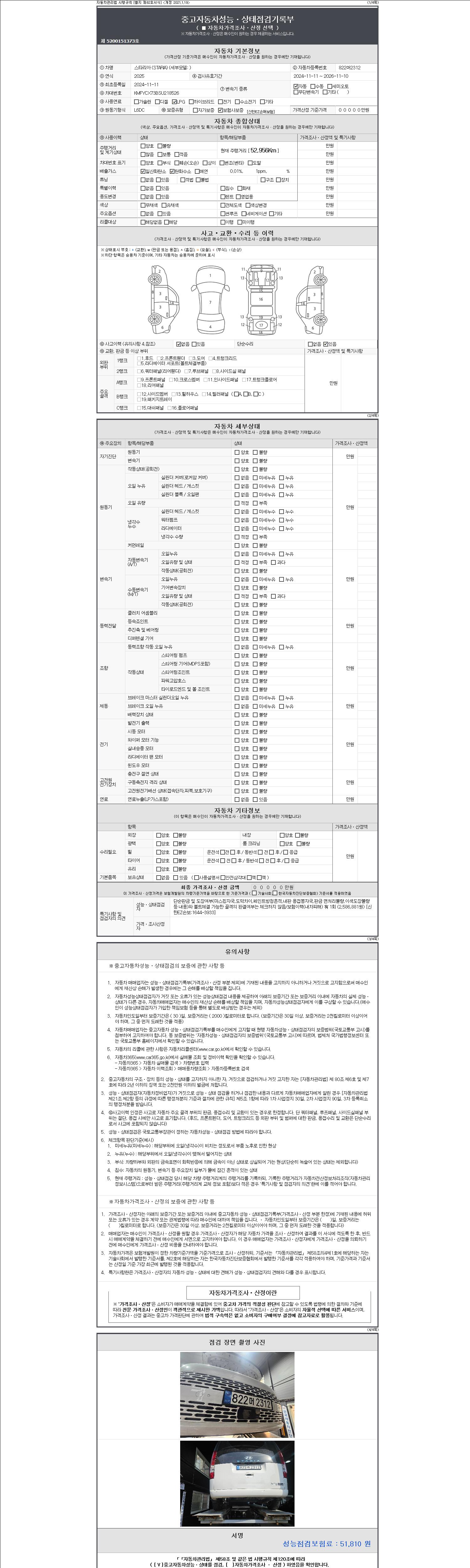 자동차관리법 시행규칙 제120조의 규정에 따라 별지 제 82호서식 《중고자동차 성능, 상태점검 기록부》를 발행한 성능, 상태점검자 및 매매자는 아래의 보증기간 또는 보증거리 이내의 중고자동차, 성능점검 기록부에 기재된 내용과 자동차의 실제 성능, 상태가 다른 경우 계약 또는 관계법령에 따라 매수인에 대하여 책임을 집니다.
