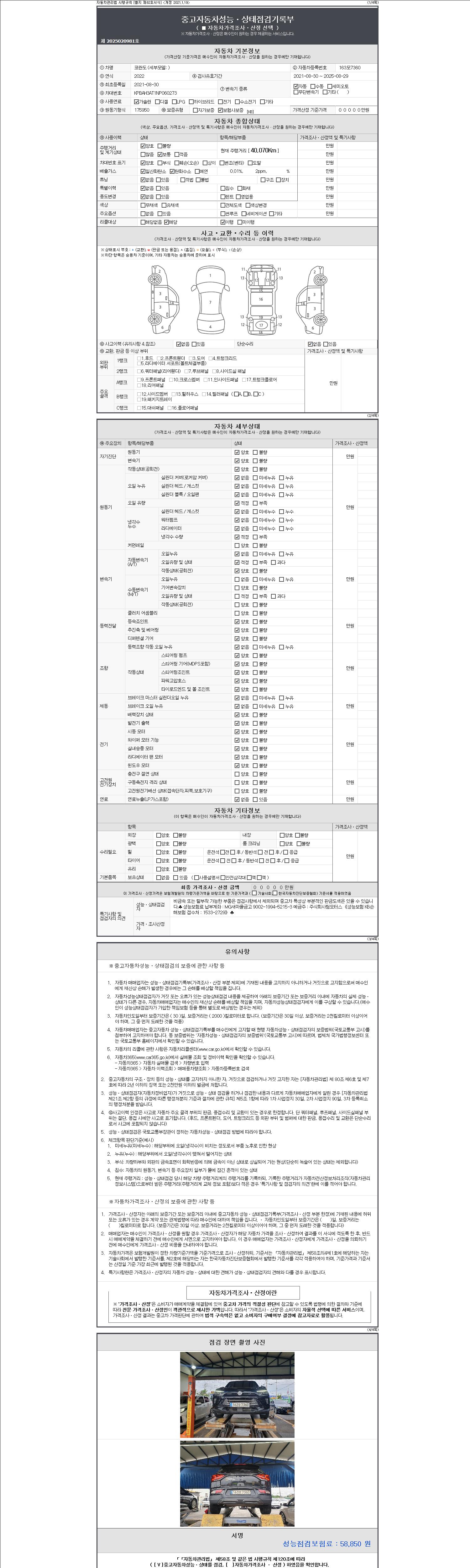 - 2. 차량 등록증이나 성능점검지 등을 상담자에게 요청및 확인하시고 사전에 미리 점검 하시기를 권유드립니다.