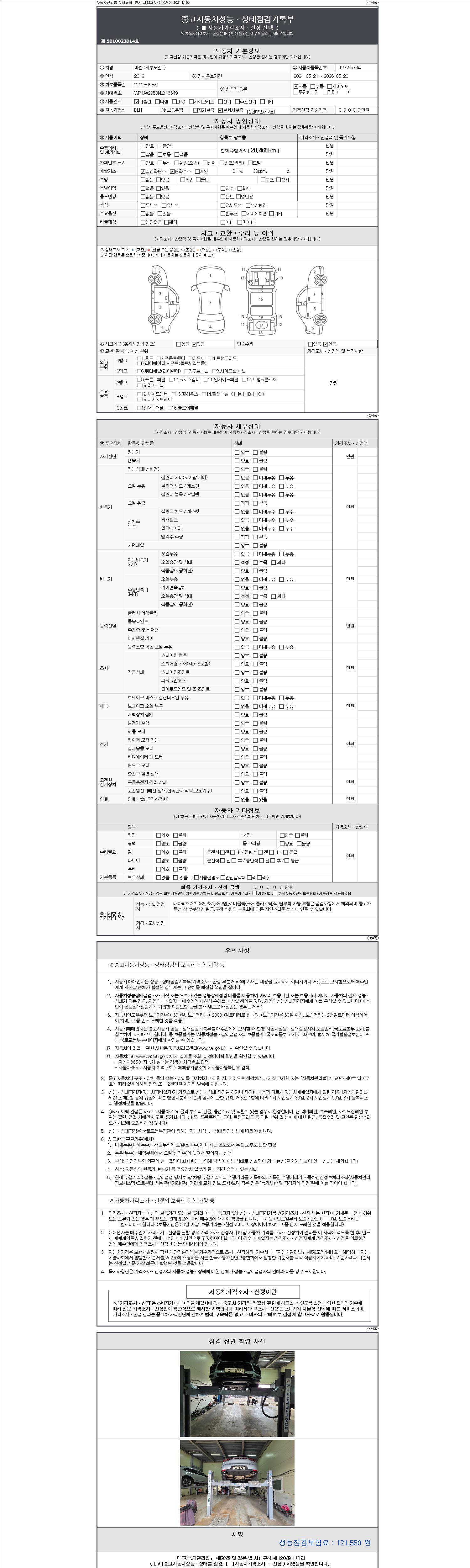 자동차관리법 시행규칙 제120조의 규정에 따라 별지 제 82호서식 《중고자동차 성능, 상태점검 기록부》를 발행한 성능, 상태점검자 및 매매자는 아래의 보증기간 또는 보증거리 이내의 중고자동차, 성능점검 기록부에 기재된 내용과 자동차의 실제 성능, 상태가 다른 경우 계약 또는 관계법령에 따라 매수인에 대하여 책임을 집니다.