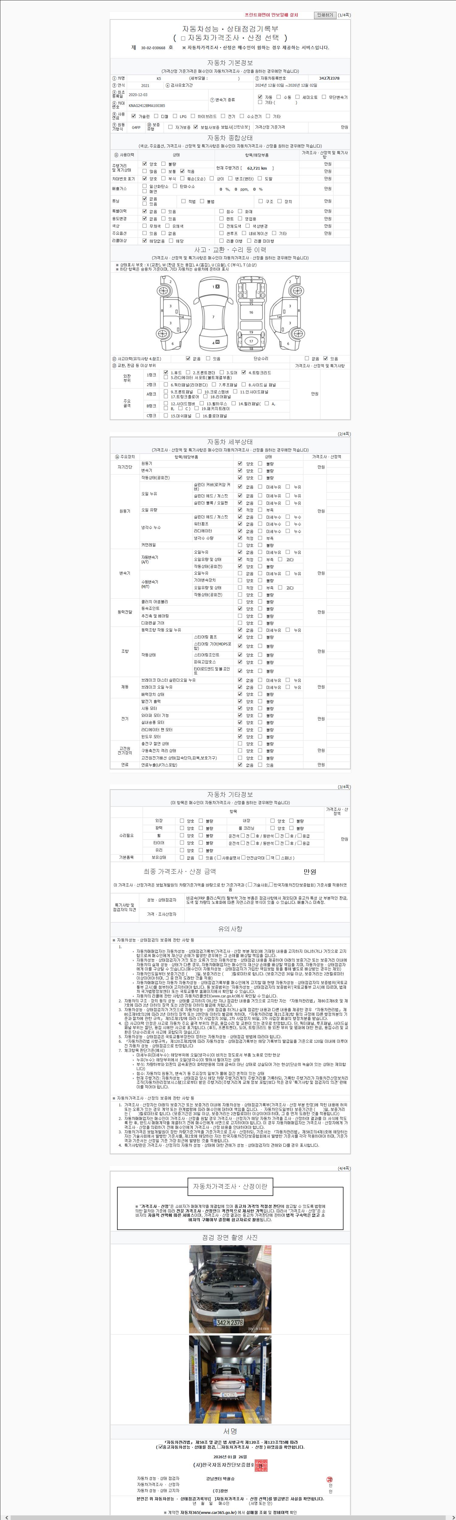 -중고자동차 매매업자를 통해 차량을 구입하실 경우 반드시 "중고자동차 성능, 상태점검 기록부"를 교뷰 받으셔야 하며, 매매업자는 반드시 의무 교부 하여야 압니다.