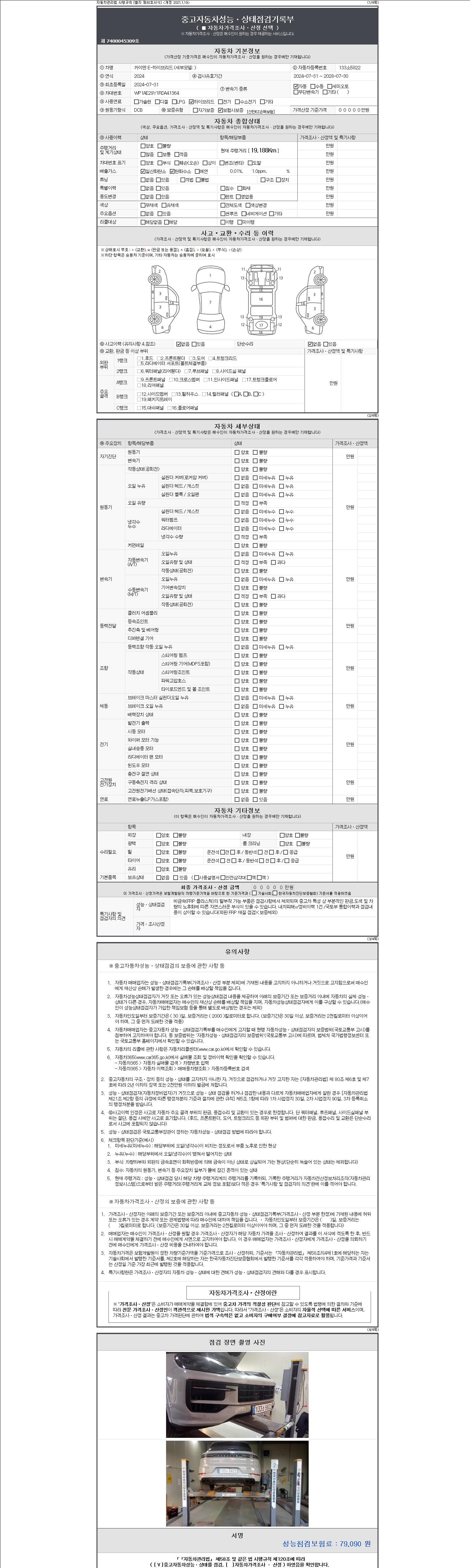 자동차관리법 시행규칙 제120조의 규정에 따라 별지 제 82호서식 《중고자동차 성능, 상태점검 기록부》를 발행한 성능, 상태점검자 및 매매자는 아래의 보증기간 또는 보증거리 이내의 중고자동차, 성능점검 기록부에 기재된 내용과 자동차의 실제 성능, 상태가 다른 경우 계약 또는 관계법령에 따라 매수인에 대하여 책임을 집니다.