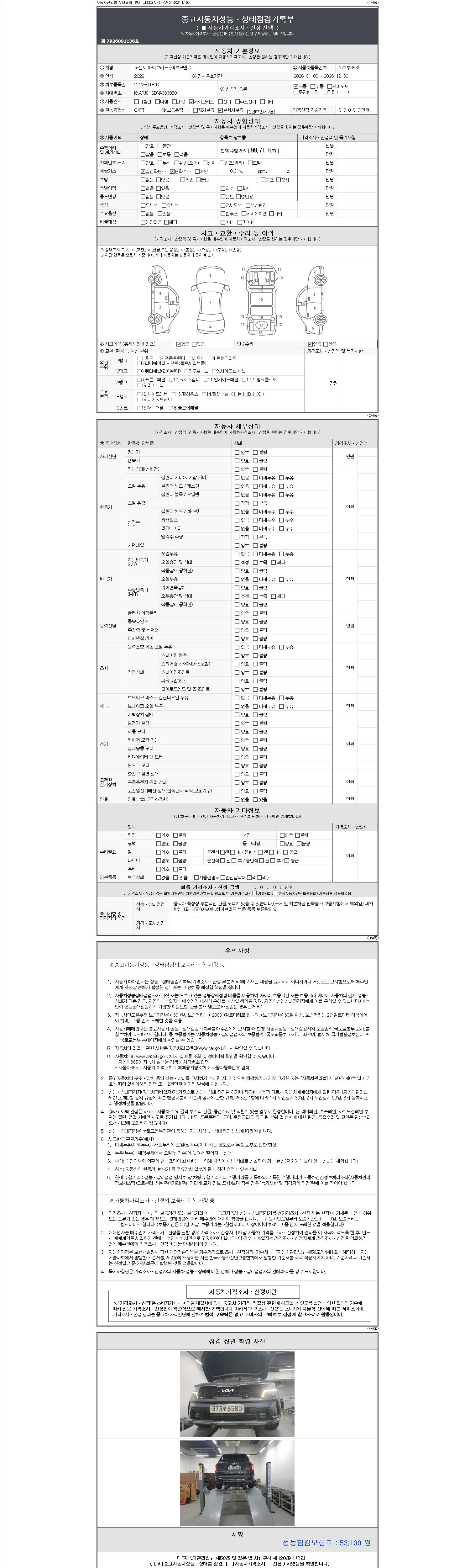 자동차관리법 시행규칙 제120조의 규정에 따라 별지 제 82호서식 《중고자동차 성능, 상태점검 기록부》를 발행한 성능, 상태점검자 및 매매자는 아래의 보증기간 또는 보증거리 이내의 중고자동차, 성능점검 기록부에 기재된 내용과 자동차의 실제 성능, 상태가 다른 경우 계약 또는 관계법령에 따라 매수인에 대하여 책임을 집니다.